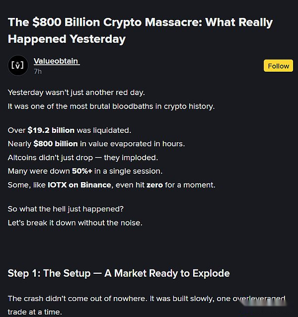 وفقًا لتحليل منشور تم تداوله على نطاق واسع في Binance Square، لم يأت الانهيار دون سابق إنذار، ولكنه كان يختمر ببطء في بيئة سوق عالية الاستدانة.