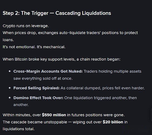 <ب>والثاني هو “الزناد” للتفاعل المتسلسل.تعمل أسواق العملات المشفرة على الرافعة المالية، وعندما تنخفض الأسعار إلى ما دون مستويات الدعم الرئيسية، تبدأ آليات التصفية التلقائية في البورصات.لم تكن هذه عملية بيع عاطفية، بل كانت عملية آلية نفذتها البورصة لحماية قروضها الخاصة.