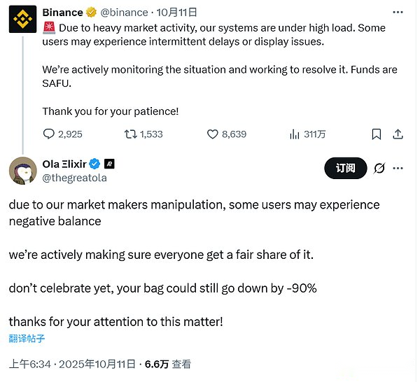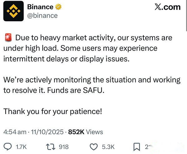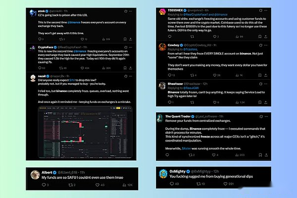 <ب>عندما كان السوق في أمس الحاجة إلى السيولة، توقفت بعض البورصات المركزية (CEX) عن العمل..خلال فترة ذروة التصفية، شهدت منصات التداول مثل Binance تأخيرات في النظام وانقطاعات في التداول، وأفاد عدد كبير من المستخدمين بعدم قدرتهم على تنفيذ الأوامر أو إدارة المراكز، مما أدى إلى زيادة الخسائر.