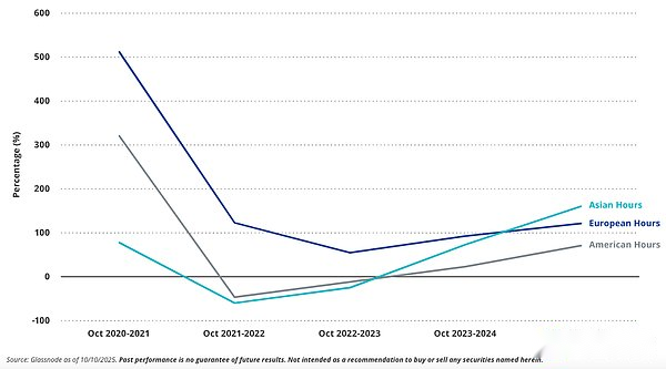 <ص><ب>يرتبط سعر BTC ارتباطًا وثيقًا بـ M2 العالمي<ص><ص>لقد ارتبط سعر BTC منذ فترة طويلة ارتباطًا وثيقًا بارتفاع وانخفاض المعروض النقدي العالمي.منذ عام 2014، كان ارتباط البيتكوين بإجمالي نمو M2 العالمي حوالي 0.5 (r² = 0.25)، مما يعني أن التغيرات في السيولة الورقية تفسر إلى حد كبير عوائدها على المدى الطويل.<ص>وفي حين تميل هذه العلاقة إلى الضعف خلال الصدمات القصيرة الأجل (مثل جائحة كوفيد-19 في عام 2020، أو انتخابات عام 2024، أو “الخوف من التعريفات الجمركية” في عام 2025)، فإن الاتجاه الأوسع للتوسع النقدي لا يزال يهيمن على دورات البيتكوين.يُظهر تحليل الانحدار متعدد المتغيرات للمعروض من العملات الورقية الخمس الرئيسية وسعر البيتكوين أن التغيرات في M2 تفسر أكثر من نصف التباين في البيتكوين خلال العقد الماضي (r² = 0.54).<ص>وقد تضاعفت السيولة بين أكبر خمس عملات في العالم تقريبا منذ عام 2013، من 50 تريليون دولار إلى ما يقرب من 100 تريليون دولار، وخلال هذه الفترة ارتفع سعر البيتكوين أكثر من 700 مرة.عبر العملات، يظل المعروض النقدي باليورو M2 هو المتغير التفسيري الأقوى (r = 0.69، t = 10)، مما يسلط الضوء على دور البيتكوين المتنامي كأصل احتياطي محايد في سياق انخفاض قيمة العملة المتزامن.<ص>تتوافق طريقة عرض الماكرو التاريخية لـ VanEck مع هذه البيانات.في مارس 2023، قال جان فان إيك، الرئيس التنفيذي لشركة VanEck، على قناة CNBC، إن كلا من الذهب والبيتكوين يبدو أنهما على استعداد للدخول في دورة سوق صاعدة متعددة السنوات مع اقتراب الاحتياطي الفيدرالي من نهاية سياسته التشديدية.ضمن هذا الإطار، تتمثل أطروحة VanEck في أن Bitcoin بمثابة “الذهب الرقمي” وسوف تستفيد عندما تضعف البنوك وتكون أسعار الفائدة على وشك الانخفاض وتتوسع السيولة مرة أخرى.<ص>عندما يتعلق الأمر باكتشاف أسعار البيتكوين، فقد تغيرت ديناميكيات السوق الإقليمية بشكل كبير خلال العامين الماضيين.كما هو موضح في الرسم البياني أدناه، بينما في وقت سابق من هذه الدورة وفي دورة 2020-2022، كانت عوائد البيتكوين خلال ساعات التداول الآسيوية متخلفة عن جلسات التداول الغربية، والآن تقود ساعات التداول الآسيوية عوائد البيتكوين عالميًا.وفي هذا العام، لاحظنا أن آسيا قادت الارتفاع الأخير في أواخر الصيف، وهي الآن تقود الانخفاض الأخير.وقد يعكس هذا التناوب نقص السيولة في الأسواق الآسيويةوذلك لأن البنكين المركزيين في الهند والصين على استعداد للتضحية بنمو العملة المحلية للدفاع عن عملتيهما.يتوافق هذا النمط مع دور البيتكوين كأصل “مكافحة طباعة الأموال” في دورات السيولة العالمية.<ص><ب>جلسة تداول BTC متوسط ​​العائد السنوي للساعة<ص><ح2>2. النفوذ