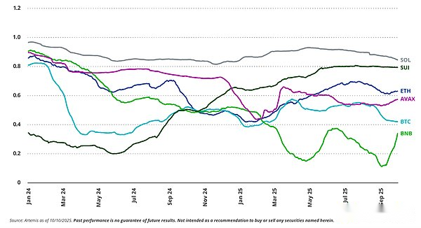 <ص><ب>علاقة لمدة عام بين إيرادات blockchain وأسعار الرمز المميز<ص><ص>في حين أن السيولة الكلية وهيكل السوق هما مؤشران لدورات بيتكوين قصيرة المدى، وتؤثر هذه المؤشرات بشكل عام على الرغبة في المخاطرة عبر سوق العملات المشفرة،تمثل الأساسيات الموجودة على السلسلة أوضح نافذة على التطبيق الفعلي للعملات المشفرة.عبر الشبكات الرئيسية، تُظهر أسعار التوكنات ارتباطًا ذا دلالة إحصائية مع الإيرادات الناتجة عن سلاسل الكتل الخاصة بها، مما يثبت أن الاستخدام والقيمة متشابكان.<ص>من بين سلاسل الكتل الكبيرة، تتمتع Solana بأقوى ارتباط بين إيرادات الشبكة وأداء الرمز المميز (r² = 0.71، t² = 30)، في حين أن BNB الخاص بـ Binance Chain لديه أضعف ارتباط (r² = 0.13).العلاقة بين السبب والنتيجة بين الاثنين معقدة: ارتفاع أسعار التوكنات يحفز المزيد من نشاط المستخدم المدر للدخل، في حين أن استمرار دخل الرسوم يعزز التقييمات طويلة الأجل.مع نضوج النظم البيئية الرئيسية لتطبيقات البلوكشين، فإنها توفر قنوات جديدة للنشاط يمكنها تحسين العلاقة بين السعر والإيرادات على السلسلة.وباعتبارها أحدث عضو في مجموعات البلوكتشين الستة في الرسم البياني أعلاه، فإن نمو شبكة Sui على مدار العامين الماضيين في تطبيقات DeFi وألعاب المستهلك/NFT هو أوضح دليل على هذه العلاقة.<ص>بالنسبة للبيتكوين، تظل المقاييس الموجودة على السلسلة مثل حجم المعاملات ورسوم الشبكة أقل تنبؤًا بتحركات الأسعار اليومية من السيولة أو الرافعة المالية.ومع ذلك، فهي لا تزال دليلًا قويًا على صحة الشبكة.نحن نعتقد،تعد عملة البيتكوين (وبدرجة أقل الإيثريوم) أقل انفصالًا نسبيًا عن هذه الأساسيات من شبكات البلوكتشين الأخرى، حيث يتم استخدامها بشكل متزايد كأصول نقدية مخزنة للقيمة من خلال خزائن خارج السلسلة والمنتجات المتداولة في البورصة (ETPs).في حين أن هذه العوامل مواتية لـ BTC و ETH، فإن النمو المستمر في الإيرادات على السلسلة ونشاط المستخدم هو أقوى دليل على أن عرض القيمة لشبكات blockchain يتجاوز المضاربة.<ص>وبغض النظر عن المقاييس الموجودة على السلسلة، لا تزال عملة البيتكوين مثل “عمر ثماني سنوات” على منحنى اعتمادها، كما وصفها جان فان إيك في عام 2023، لكن ارتباطها المتزايد بالسيولة العالمية والرافعة المالية يشير إلى ذلكتتطور BTC من أصل مضارب إلى تحوط كلي ضد انخفاض قيمة العملة الورقية.<ص>اليوم، أصبحت البيتكوين أشبه بالمراهق؛ على الرغم من نمو BTC، نتوقع أن تستمر معنويات السوق في التقلب في السنوات القادمة.