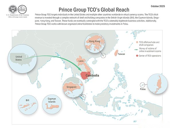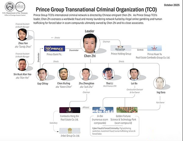 قام مكتب مراقبة الأصول الأجنبية بإدراج منظمة برينس جروب الإجرامية العابرة للحدود الوطنية كأشخاص أجانب يشكلون منظمة إجرامية كبيرة عبر وطنية وفقًا للأمر التنفيذي رقم 13581، بصيغته المعدلة، حيث ذكر تشين تشي، ولي بو، وتشو تشونغبياو، وغاي تشاي، وإنغ دارا، وثيت لي، وتشن شيولينغ، ووي تشيانجيانغ، ومجموعة جينبي المحدودة، ومنتجع جينكاي فورتشن. Co., Ltd.، وWarp Data Lao Sole Co. Ltd. تم إدراج الشركات في القائمة لأنها مملوكة أو مسيطر عليها بشكل مباشر أو غير مباشر، أو عملت لصالح أو تزعم أنها تعمل لصالح أو نيابة عن منظمة Prince Group الإجرامية العابرة للحدود الوطنية.ص>