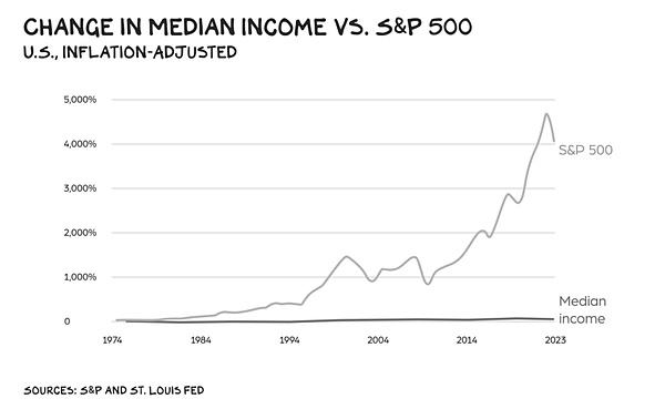 <سبان ليف = "">في أبريل 2024، نشر سكوت جالواي، الأستاذ في كلية ستيرن لإدارة الأعمال بجامعة نيويورك، مقالًا بعنوان “الحرب على الشباب>”. ويذكر أنه في الفترة من 1974 إلى 2024، ارتفع متوسط الأجور الحقيقية في الولايات المتحدة بنسبة 40%، في حين ارتفع مؤشر ستاندرد آند بورز 500 بنسبة 4000% خلال نفس الفترة.فرق كامل مائة مرة.ص>