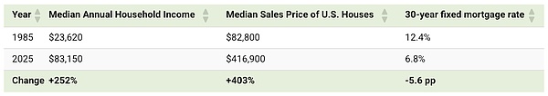 مقارنة متوسط الدخل وأسعار المنازل وأسعار الفائدة على القروض في الولايات المتحدة في عامي 1985 و2025|المصدر: Visual Capitalistص>