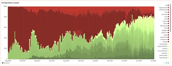 應⽤的價值捕獲則更加直接:通過⼿續費、訂閱費、服務費等⽅式產⽣可驗證的鏈上收⼊。這些收⼊可以直接⽤於代幣回購銷毀、分紅,或再投資於增⻓,形成⼀個緊密的反饋閉環。應⽤的收⼊來源變得堅實——更多來⾃實際的服務費率收⼊,而⾮代幣激勵或市場敘事。