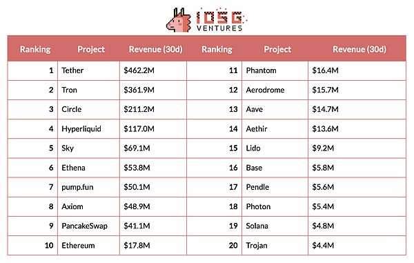 上圖粗略對⽐了 2020 年⾄今協議(紅⾊)和應⽤(綠⾊)的收⼊。我們可以看到應⽤捕獲的價值在逐漸上升,並在今年達到約 80% 的⽔平。下表列舉了 TokenTerminal 統計的 30 ⽇協議收⼊排⾏,在 20 個項⽬中 L1/L2 只佔到 20%。尤其突出的是穩定幣、DeFi 、錢包和交易⼯具等應⽤。