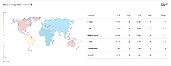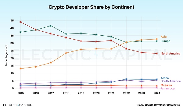 Electric Capital 2024年開發者報告顯⽰,亞洲地區的區塊鏈開發者佔⽐⾸次達到32%,超越北美地區成為全球最⼤的開發者聚集地。