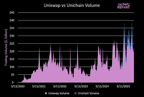 作為參考,BNB 鏈佔比從一年前的 2% 上升,Base 鏈佔比較一年前的 15.3% 也有所上升。最後,Unichain 目前佔 Uniswap 總交易量的 4.2%。