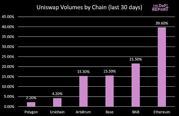 Uniswap 目前 40% 的交易量來自以太坊,較去年的 55% 有所下降。