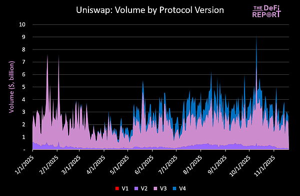 儘管本輪周期大部分投機活動轉向了 Solana 和 Hyperliquid,但 Uniswap 的交易量依然保持增長。該協議在 10 月 6 日當周的交易量達到峰值 340 億美元,比 2021 年周期中的最佳單周交易量增長了 50%。