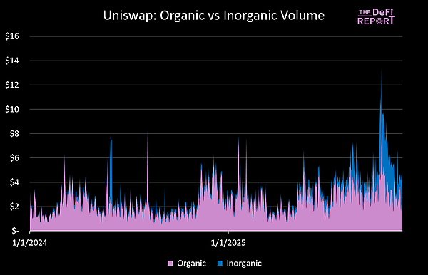 Uniswap 的交易量看起來非常健康。但我們必須明確的是,這些數據中其實包含了「清洗交易量」。因此,我們希望更好地了解 Uniswap 的真實交易量,即「有機交易量」與其「無機交易量」之間的區別。