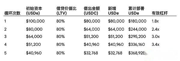 このメカニズムのレバレッジ効果をより直観的に示すために、次の表では例として初期資本 100,000 ドルを使用し、LTV 80% を想定したリボルビング融資プロセスをシミュレートしています。(データは重要ではありません。主にロジックに依存します)