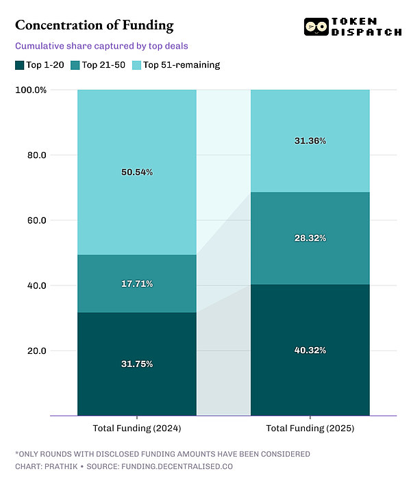上位20ラウンドは、2024年には32%だったのに対し、2025年には全資金調達額の40%を占めることになる。上位50ラウンドにズームインすると、その割合は2024年の49%から今年は69%に増加する。