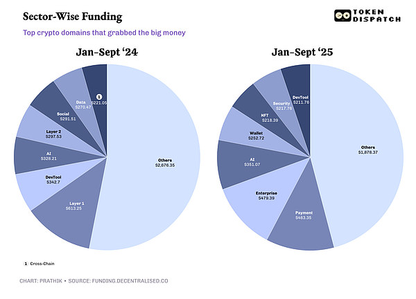 創業者にとって、これは、AI、決済、エンタープライズ インフラストラクチャ、および実世界資産のトークン化 (RWA) でビジネスを始める場合、資金がそこにあることを意味します。これらの分野以外では、2024 年には業界の中心を占めるレイヤー 1 およびレイヤー 2 インフラストラクチャ、開発者ツール、ソーシャルなどの分野で資金が枯渇しています。