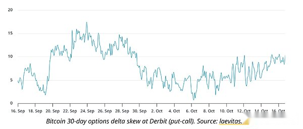 laevitas.chのデータによると、プロのトレーダーの心理を測るビットコインの30日オプションのデルタスキュー指標は10%を超え、中立範囲の-6%から+6%を大幅に上回っている。これは、市場参加者が価格下落のリスクをヘッジするために、プットオプションの購入に高いコストを支払っても構わないと考えていることを示唆しています。