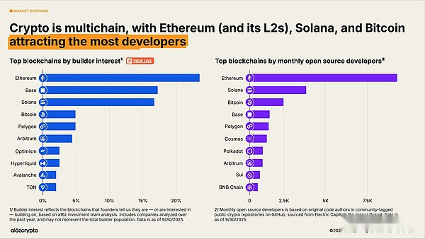 من منظور بيئة المطورين، لا يزال عالم العملات المشفرة يقدم هيكلًا متعدد السلاسل، حيث تشكل Bitcoin وEthereum وشبكتها من الطبقة الثانية، وSolana أماكن تجمع المطورين الثلاثة الأساسية.ستصبح Ethereum وشبكتها من الطبقة الثانية الهدف المفضل للمطورين الجدد في عام 2025، وتعد Solana واحدة من أسرع الأنظمة البيئية نموًا – وقد زاد اهتمام المطورين بنسبة 78٪ في العامين الماضيين.تأتي هذه البيانات من المسح والتحليل الذي أجراه فريق الاستثمار في تشفير a16z لمنصات التطوير المفضلة لرواد الأعمال.ص>