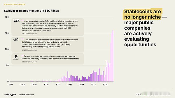 وبعد بضعة أشهر، كان الاكتتاب العام الأولي لشركة Circle بقيمة 10 مليارات دولار بمثابة الدخول الرسمي لجهة إصدار العملة المستقرة إلى صفوف المؤسسات المالية الرئيسية.وفي يوليو/تموز، تم تشريع “قانون GENIUS” الذي دعمه كلا الحزبين رسميًا، والذي يوفر مبادئ توجيهية واضحة لعمل شركات البناء والمؤسسات.منذ ذلك الحين، زاد تواتر ذكر العملات المستقرة في وثائق هيئة الأوراق المالية والبورصة بنسبة 64٪، وكانت هناك زيادة في إعلانات التخطيط من المؤسسات المالية الكبرى.ص>