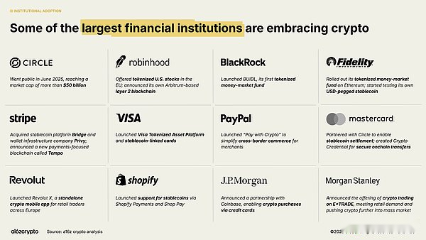 التطبيقات المؤسسية تتسارع.بدأت المؤسسات المالية التقليدية مثل Citigroup وFidelity وJPMorgan Chase وMastercard وMorgan Stanley وVisa (أو تخطط) لتقديم منتجات العملات المشفرة مباشرة إلى المستهلكين، مما يسمح لهم بشراء وبيع والاحتفاظ بالأصول الرقمية إلى جانب الأدوات التقليدية مثل الأسهم والمنتجات المتداولة في البورصة.وفي الوقت نفسه، تعمل منصات مثل PayPal وShopify على مضاعفة المدفوعات، وبناء البنية التحتية للمعاملات اليومية بين التجار والمستهلكين.ص>