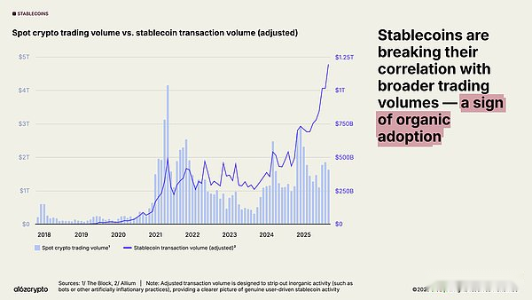 بعد التعديل (باستثناء البيانات من الروبوتات وحجم الغسيل الاصطناعي)، بلغ حجم المعاملات الحقيقية للعملات المستقرة في الأشهر الـ 12 الماضية 9 تريليون دولار أمريكي، بزيادة سنوية قدرها 87٪، وأكثر من خمسة أضعاف حجم معالجة PayPal، وأكثر من نصف حجم Visa.ص>