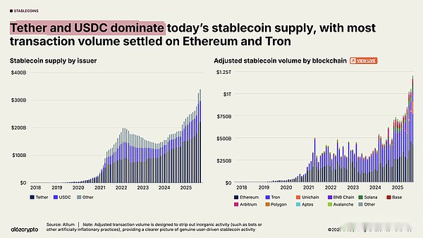 الرمز الأكثر نضجًا لسوق العملات المشفرة في عام 2025 هو ظهور العملات المستقرة. في السنوات السابقة، تم استخدام العملات المستقرة بشكل أساسي لتسوية معاملات العملات المشفرة المضاربة، ولكن في العامين الماضيين، أصبحت الطريقة الأسرع والأقل تكلفة لتداول الدولار الأمريكي في العالم – معالجة ملايين المعاملات في الثانية، بتكلفة واحدة أقل من سنت واحد، وتغطي معظم المناطق حول العالم.ص>