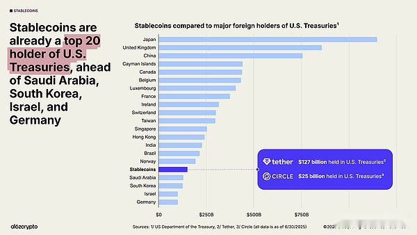 أصبحت العملات المستقرة قوة مهمة في الاقتصاد الكلي العالمي: يوجد أكثر من 1٪ من الدولار الأمريكي في شكل عملات مستقرة رمزية على سلاسل الكتل العامة، وارتفع تصنيف حيازاتها من الديون الأمريكية إلى المرتبة 17 من المرتبة 20 في العام الماضي.تحتفظ العملات المستقرة حاليًا بما يزيد عن 150 مليار دولار من الديون الأمريكية، أي أكثر من ممتلكات العديد من الدول ذات السيادة.ص>