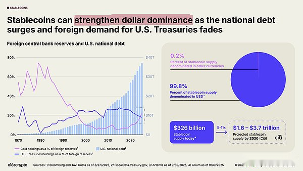 لكن العملات المستقرة تخالف الاتجاه: أكثر من 99٪ من العملات المستقرة مقومة بالدولار الأمريكي، ومن المتوقع أن ينمو حجمها عشرة أضعاف إلى أكثر من 3 تريليون دولار بحلول عام 2030، مما قد يوفر مصدرا قويا ومستداما للطلب على الديون الأمريكية في السنوات المقبلة.ص>