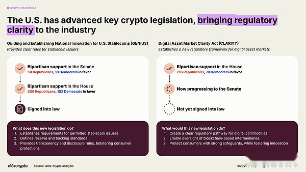 ويشير إقرار قانون GENIUS هذا العام وموافقة مجلس النواب على قانون CLARITY إلى أن الطرفين قد توصلا إلى توافق في الآراء: لن تبقى الأصول المشفرة في الولايات المتحدة فحسب، بل ستتمتع أيضًا بالظروف اللازمة للازدهار والتطور.يبني مشروعا القانون معًا إطارًا لتنظيم العملات المستقرة وهيكل السوق والإشراف على الأصول الرقمية الذي يوازن بين الابتكار وحماية المستثمرين.وفي الوقت نفسه، ألغى الأمر التنفيذي رقم 14178 التوجيهات السابقة لمكافحة العملات المشفرة وأنشأ مجموعة عمل مشتركة بين الوكالات لتحديث سياسة الأصول الرقمية الفيدرالية.ص>