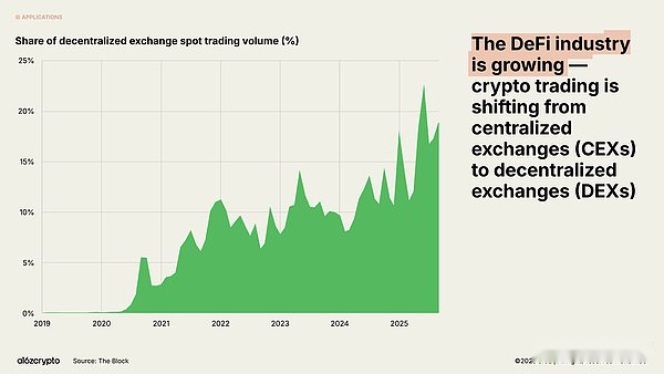 لقد تطور ما كان في السابق مجرد ساحة اختبار متخصصة للمتبنين الأوائل إلى نظام بيئي متنوع يضم عشرات الملايين من المشاركين النشطين شهريًا.ما يقرب من خمس حجم التداول الفوري اليوم يحدث من خلال البورصات اللامركزية.ص>