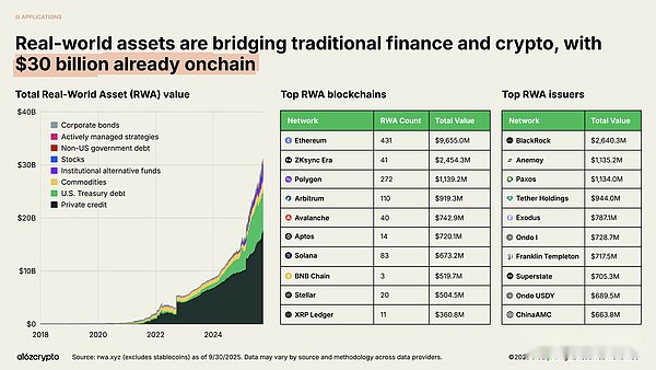 تعمل أصول العالم الحقيقي – بما في ذلك الأصول التقليدية مثل سندات الخزانة الأمريكية وصناديق أسواق المال والائتمان الخاص والعقارات التي يتم ترميزها على السلسلة – على سد الفجوة بين العملات المشفرة والتمويل التقليدي.يصل إجمالي حجم سوق RWA الرمزية إلى 30 مليار دولار أمريكي، وهو ما زاد حوالي أربع مرات في العامين الماضيين.ص>