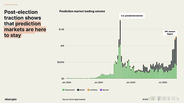 اخترق سوق التنبؤ الدائرة السائدة خلال دورة الانتخابات الرئاسية الأمريكية لعام 2024، حيث وصل إجمالي حجم التداول الشهري للمنصتين الرائدتين Polymarket وKalshi إلى مليارات الدولارات.وعلى الرغم من أنها واجهت شكوكا حول ما إذا كان بإمكانها الحفاظ على النشاط في السنوات غير الانتخابية، إلا أن حجم المعاملات لهذه المنصات زاد بما يقرب من خمسة أضعاف منذ بداية عام 2025، ليقترب من الذروة التاريخية.ص>