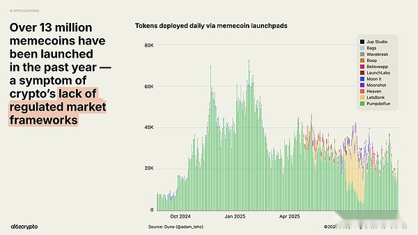 وفي غياب الإشراف الواضح، شهدت Memecoin نموًا هائلاً، حيث تم إطلاق أكثر من 13 مليون نوع في العام الماضي.وقد تباطأ هذا الاتجاه إلى حد ما في الأشهر الأخيرة، مع انخفاض إصدارات سبتمبر بنسبة 56٪ عن يناير، حيث مهدت السياسات الحميدة والتشريعات الحزبية الطريق لمزيد من حالات استخدام بلوكتشين البناءة.ص>
