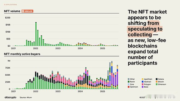 على الرغم من أن حجم معاملات سوق NFT لم يعد إلى الذروة في عام 2022، إلا أن عدد المشترين النشطين شهريًا مستمر في النمو.يبدو أن هذه الاتجاهات تشير إلى أن سلوك المستهلك يتحول من المضاربة إلى التحصيل، وتوفر تكاليف مساحة الكتلة الأرخص في سلاسل مثل Solana وBase الظروف اللازمة لذلك.ص>