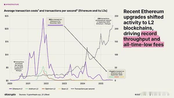 تواصل إيثريوم تطوير خارطة طريق التوسع الخاصة بها، وتم ترحيل معظم الأنشطة الاقتصادية إلى حلول الطبقة الثانية مثل Arbitrum وBase وOptimism.انخفض متوسط تكلفة معاملات L2 من حوالي 24 دولارًا في عام 2021 إلى أقل من سنت واحد اليوم، مما يجعل مساحة الكتلة المرتبطة بـ Ethereum رخيصة ووفيرة.ص>