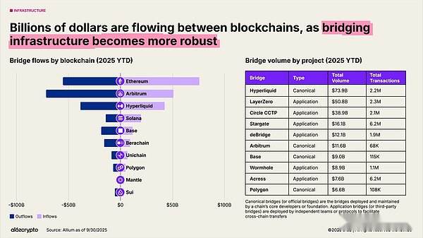 تعمل الجسور عبر السلاسل على تمكين التشغيل البيني لـ blockchain.تتيح حلول مثل LayerZero وCircle’s بروتوكول النقل عبر السلاسل للمستخدمين نقل الأصول عبر أنظمة متعددة السلاسل.شهد الجسر الأساسي لشركة Hyperliquid حجم تداول بقيمة 74 مليار دولار أمريكي منذ بداية العام حتى الآن.ص>