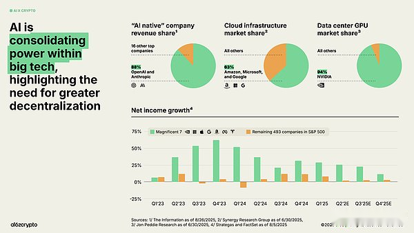 وفي الوقت نفسه، تتجمع الطبقة الحاسوبية للذكاء الاصطناعي حول حفنة من عمالقة التكنولوجيا، مما يثير المخاوف بشأن المركزية والرقابة.حاليًا، تسيطر OpenAI وAnthropic وحدهما على 88% من إيرادات المؤسسات “الأصلية للذكاء الاصطناعي”، وتمثل Amazon وMicrosoft وGoogle 63% من سوق البنية التحتية السحابية، بينما تمتلك Nvidia 94% من سوق GPU لمراكز البيانات.وقد سمح هذا الاختلال في التوازن للشركات “السبع الكبرى” بتحقيق نمو في صافي الأرباح من رقمين لعدة أرباع متتالية، في حين فشل نمو أرباح الشركات الـ 493 المتبقية في مؤشر ستاندرد آند بورز 500 بشكل عام في تجاوز التضخم.ص>