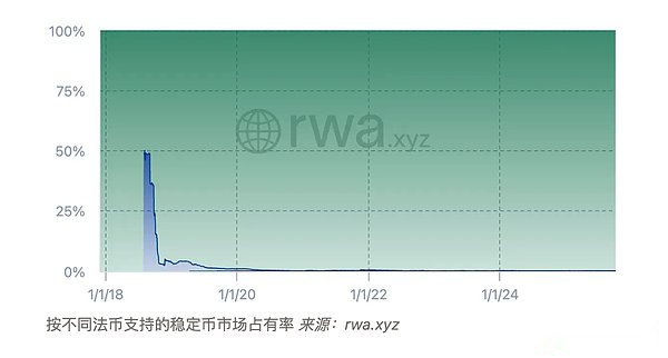 The data shows that this sector has experienced a sharp contraction.In the early stages of market development in 2018, non-USD stablecoins once occupied 48.98% of the market share, almost rivaling US dollar stablecoins (51.02%).Today, however, its total market share has collapsed to just 0.18%.In terms of absolute size, the total market capitalization of non-USD stablecoins is only $526 million, of which euro stablecoins ($456 million) account for nearly 88.7% of the absolute dominance.This shows that apart from the US dollar, no other legal currency has yet been able to form effective market competitiveness on the stablecoin track.