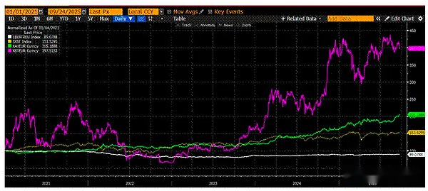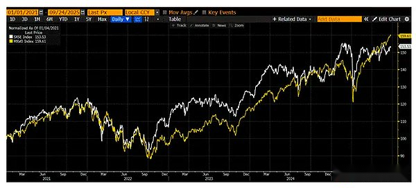 From 2021 to the present, the EuroStoxx 50 Index (white) has performed worse than the MSCI Global Index (yellow).