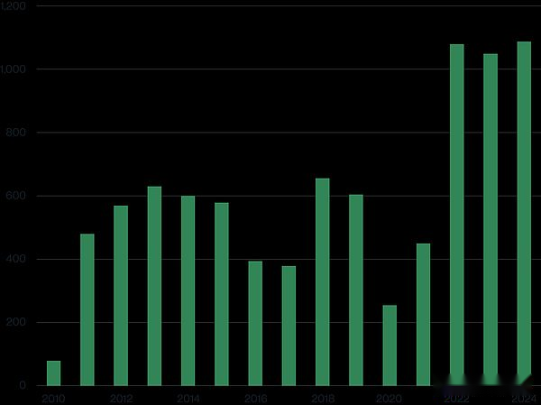 Compras de oro por parte de bancos centrales de varios países de 2010 a 2024 (unidad: toneladas)