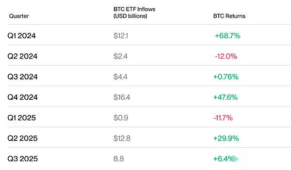 <ص>أنا أشك<ب>السبب الثالث – والأكثر جوهرية – وراء رؤيتنا لتدفقات عالية هو أنني متفائل بشأن عوائد البيتكوين في الربع الرابع.لقد وصلنا بالفعل إلى أعلى مستوياته على الإطلاق، حيث كسرنا الحاجز النفسي البالغ 100000 دولار، وتجاوز سعر البيتكوين 125000 دولار.ارتفعت أسعار البيتكوين بنسبة 9٪ في الأسبوع الأول من شهر أكتوبر وحده.على الرغم من أنها غير بديهية إلى حد ما، إلا أن الأسعار المرتفعة عادةً ما تؤدي إلى زيادة الطلب على صناديق الاستثمار المتداولة في البيتكوين حيث تحول وسائل الإعلام والشركات والمستثمرون العاديون انتباههم إلى البيتكوين.<ص>في الواقع، على الرغم من أن الارتباط لا يعني بالضرورة وجود علاقة سببية،في كل ربع سنة سجلت فيه Bitcoin عوائد مكونة من رقمين، شهدت صناديق Bitcoin ETFs أيضًا تدفقات من رقمين بمليارات الدولارات.<ص>تدفقات صناديق الاستثمار المتداولة في البيتكوين مقابل عوائد البيتكوين<ص><ص><ص>الأداء السابق لا يضمن النتائج المستقبلية.<ح2>س4: بداية جيدة