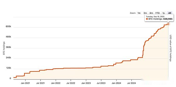 The initial form of DAT started with DAT with Bitcoin as the underlying asset.In December 2020, MicroStrategy announced that its total Bitcoin purchases in 2020 exceeded US$1 billion, and it has since begun its DAT journey.In the past five years, MicroStrategy has increased its holdings of Bitcoin several times through its own cash, bond issuance, and stock issuance.Data shows that as of September 16, MicroStrategy held a total of 638,985 Bitcoins, making it the company holder with the highest Bitcoin holdings.