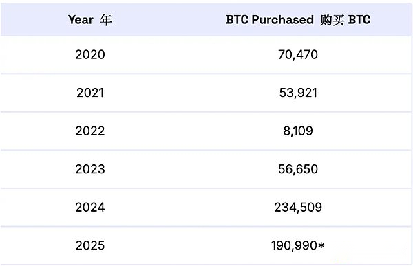 According to MicroStrategy’s Bitcoin holdings data, in the first four years, MicroStrategy basically increased its holdings of Bitcoins at a rate of less than 100,000 Bitcoins per year. In 2024, its holdings exceeded 200,000, and in 2025, its holdings were also close to 200,000 Bitcoins.