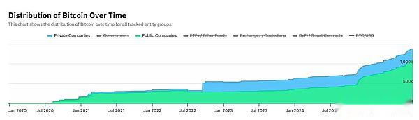 The historical trend chart of Bitcoin holdings shows that the growth of Bitcoin holdings of listed companies jumped at the beginning of 2021 and the end of 2024, mainly driven by several operations of MicroStrategy.Bitcoin holdings of unlisted companies surged in the second half of 2022, mainly driven by Block.one’s public holding of 164,000 Bitcoins in September of that year.