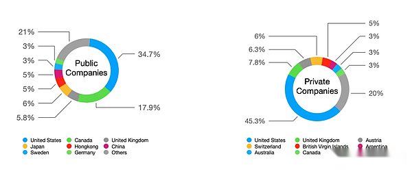 These Bitcoin holding companies cover many different countries. As shown in the data chart, half of the listed companies are from the United States and Canada, and nearly half of the unlisted companies are from the United States.