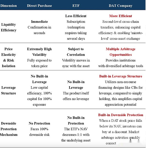 Whether it is a single-asset or multi-asset DAT company, compared with traditional companies, ETFs and other listed transactions and other financial products, DAT as an emerging business model has very distinctive characteristics:
