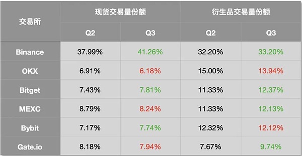 Selon les statistiques de CoinGecko, au cours du troisième trimestre, parmi les 6 principales plateformes avec une part de marché totale du volume des transactions, le volume des transactions au comptant de Binance était de 2,05 billions de dollars américains, représentant 41,26 % de la part de marché, soit une augmentation mensuelle de 3,27 % par rapport au deuxième trimestre ;les parts de marché de Bybit et Bitget ont également légèrement augmenté, avec une croissance mensuelle de 0,57 % et 0,38 % respectivement.
