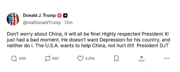 Pero la buena noticia es que el mercado bajista de octubre de 2025 ha terminado oficialmente.¿Por qué?El presidente Trump aseguró en las redes sociales el domingo por la noche que «todo estará bien» y «¡Estados Unidos quiere ayudar a China, no dañarla!».