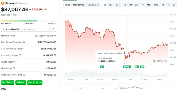 そしてウィリアムズ氏が講演する前に、BTCの価格は下落し、8万2000ドルに達することもあった。利下げの発表以来、BTCの価格はゆっくりと回復し始めており、本記事の執筆時点では87,067.46ドルで取引されています。
