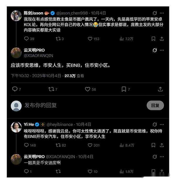 On October 4, He Yi, the “biggest sister in the currency circle”, mentioned in a reply to an X post: “I wish you hold BNB, drive Binance Auto, live in Binance community, and enjoy Binance life.”