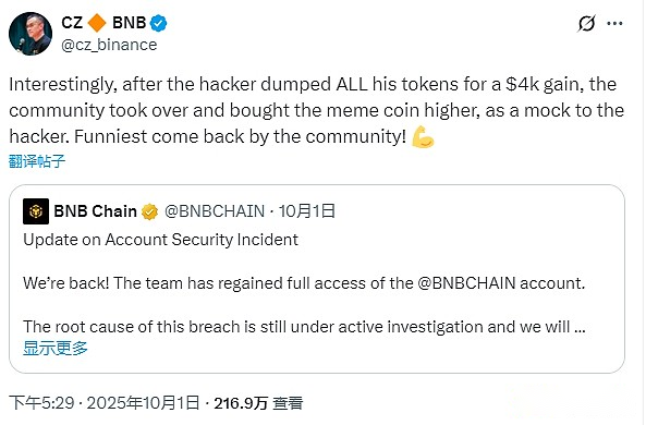 CZ posted: “What’s interesting is that after the hacker sold all the tokens and made a profit of $4,000, the community took over the transaction and bought the meme coin at a higher price to mock the hacker. It is really the funniest comeback of the community!”