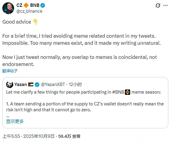 CZ agrees: “Good advice, for a while I tried to avoid meme-related content in my tweets. It just didn’t work. There were too many memes and it made my writing seem unnatural. Now I tweet normally and anything meme-related is a coincidence and not an endorsement.”